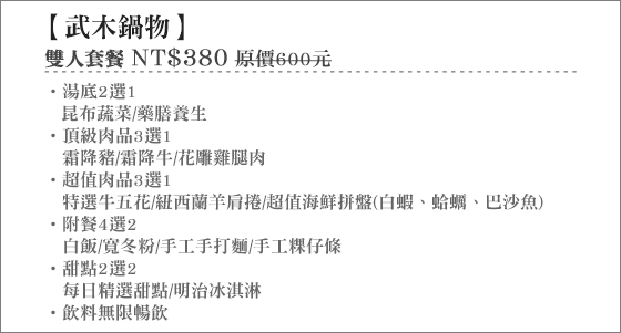 商品訊息簡述: 只要380元(雙人價)即可享有【武木鍋物】原價600元雙人套餐:昆布蔬菜/藥膳養生(湯底2選1)+霜降豬/霜降牛/花雕雞腿肉(頂級肉品3選1)+特選牛五花/紐西蘭羊肩捲/超值海鮮拼盤(超值肉品3選1)+附餐4選2+甜點2選2+飲料無限暢飲!母親節送$1720現金券!消費滿千再抽它X一掃地機器人!